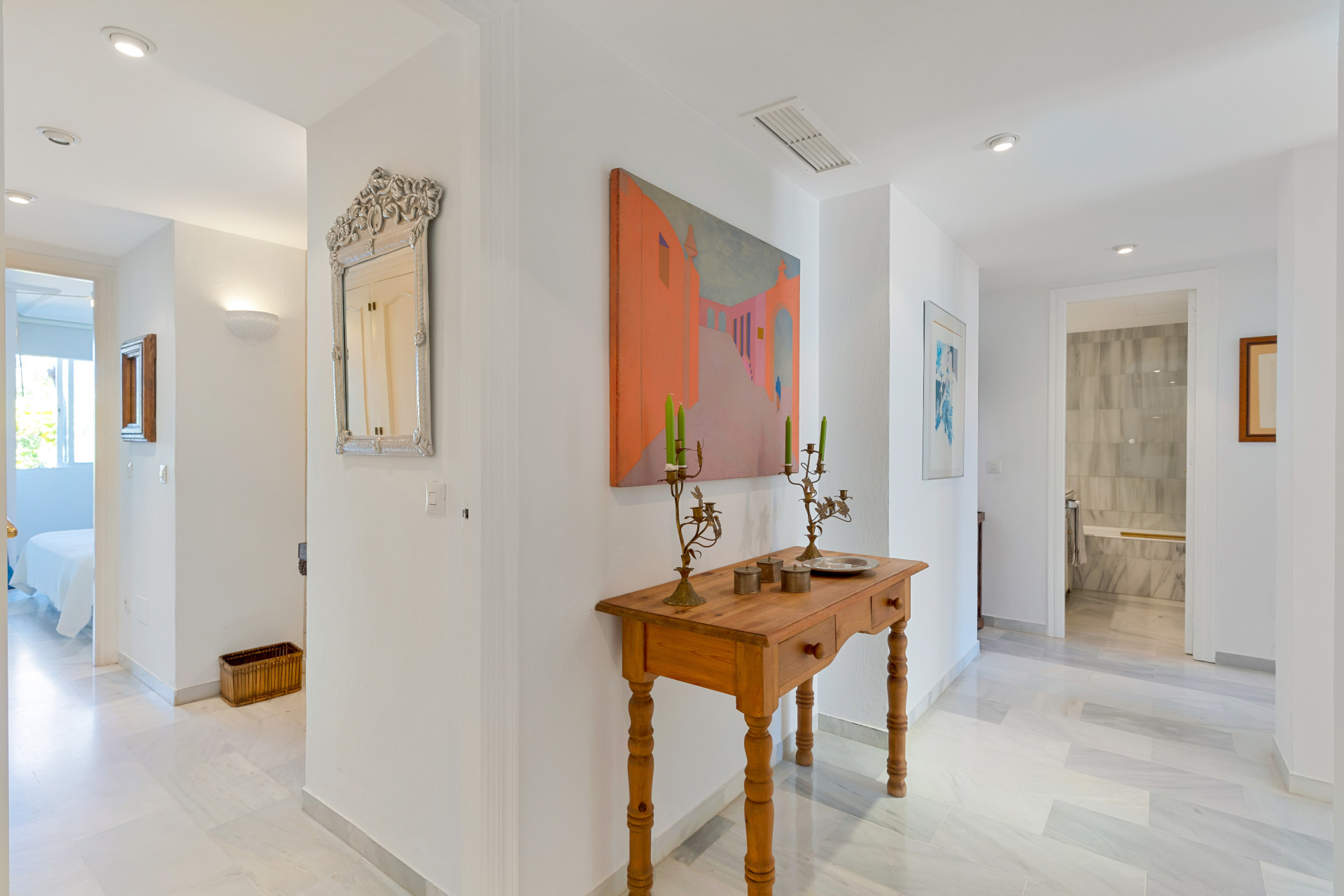 Spacious three-bedroom ground floor apartment situated in the sought-after community of Las Jacarandas, Bel Air, within a gated complex featuring beautifully landscaped gardens, two communal swimming pools, and concierge service. Ideally located close to the beach and a wide range of leisure amenities, including golf courses. This property offers an open-plan living and dining area with direct access to a private terrace and garden; a fully fitted kitchen with an enclosed utility room; two guest bedrooms with access to a private terrace; a guest bathroom; and a master bedroom with en-suite and access to the private garden. Additional features include hot and cold air conditioning, marble flooring, fitted wardrobes and a private parking space.