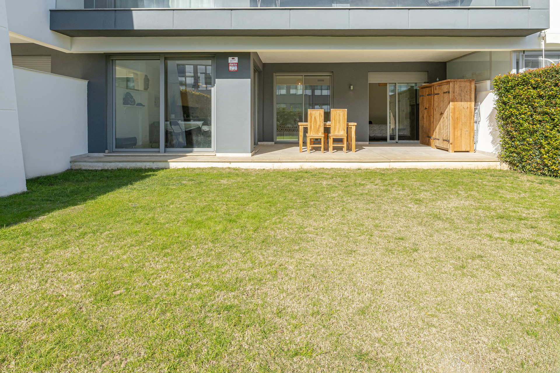 The interior is beautifully furnished and thoughtfully designed, with a modern open-plan kitchen fully equipped with high-quality appliances. The bright living area offers generous space for relaxing or entertaining and opens directly onto a private terrace and garden, providing an ideal outdoor area to enjoy the Mediterranean climate. The master bedroom features an ensuite bathroom and direct access to the garden, while the second bedroom is equally comfortable with a double bed and ample wardrobe space. Centralised air conditioning ensures comfort all year round.