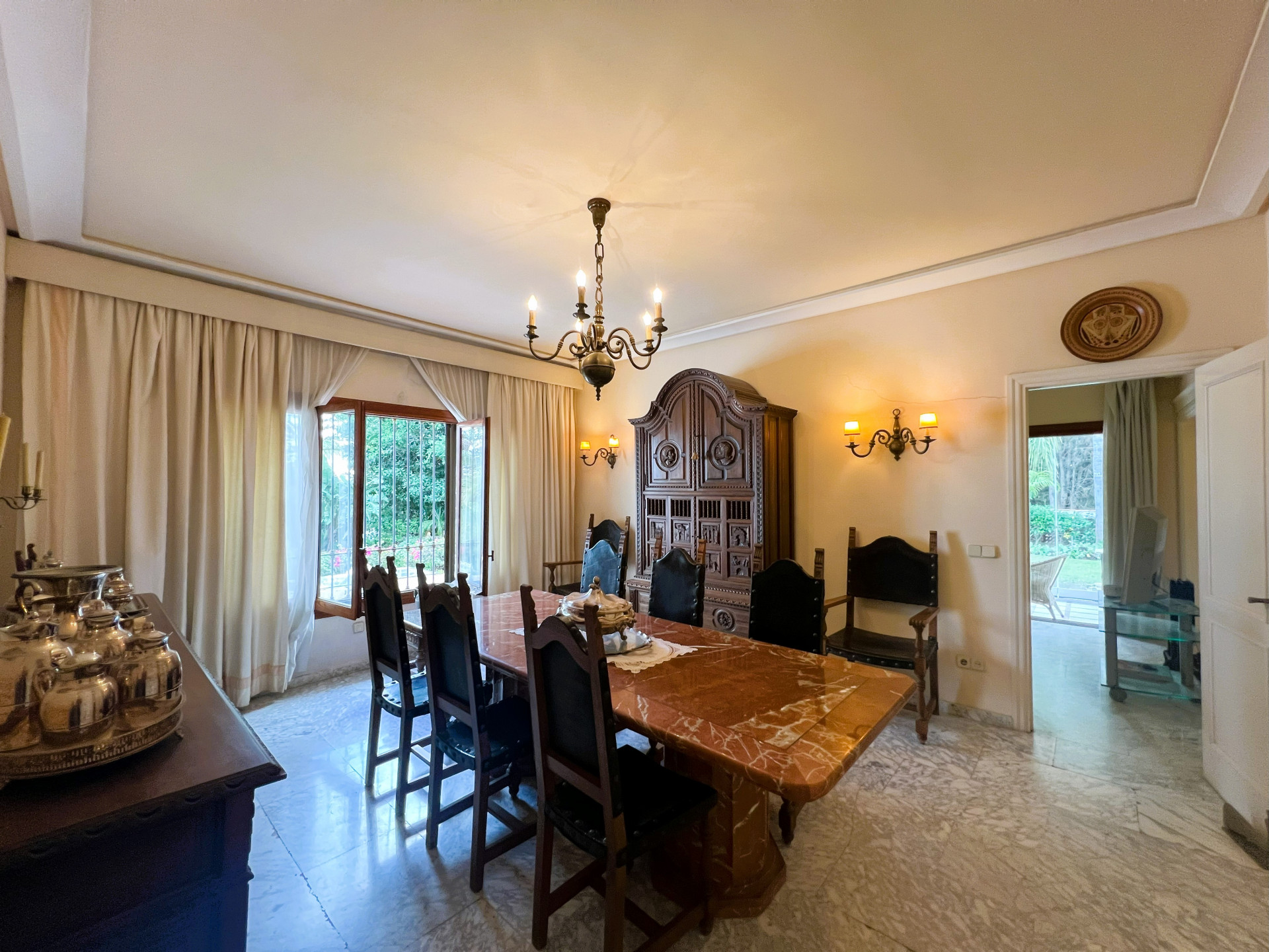 The villa offers a generous built area of 414m² on a substantial plot of 1,628m², providing ample space for comfortable family living and entertaining. Inside, there are four spacious bedrooms and three bathrooms, as well as an additional guest toilet. The property includes a private garage, a well-maintained private garden, and benefits from an advanced alarm system for added peace of mind. Although the villa requires renovation, it provides the perfect canvas for personalisation, allowing new owners to design their dream home to exact specifications.