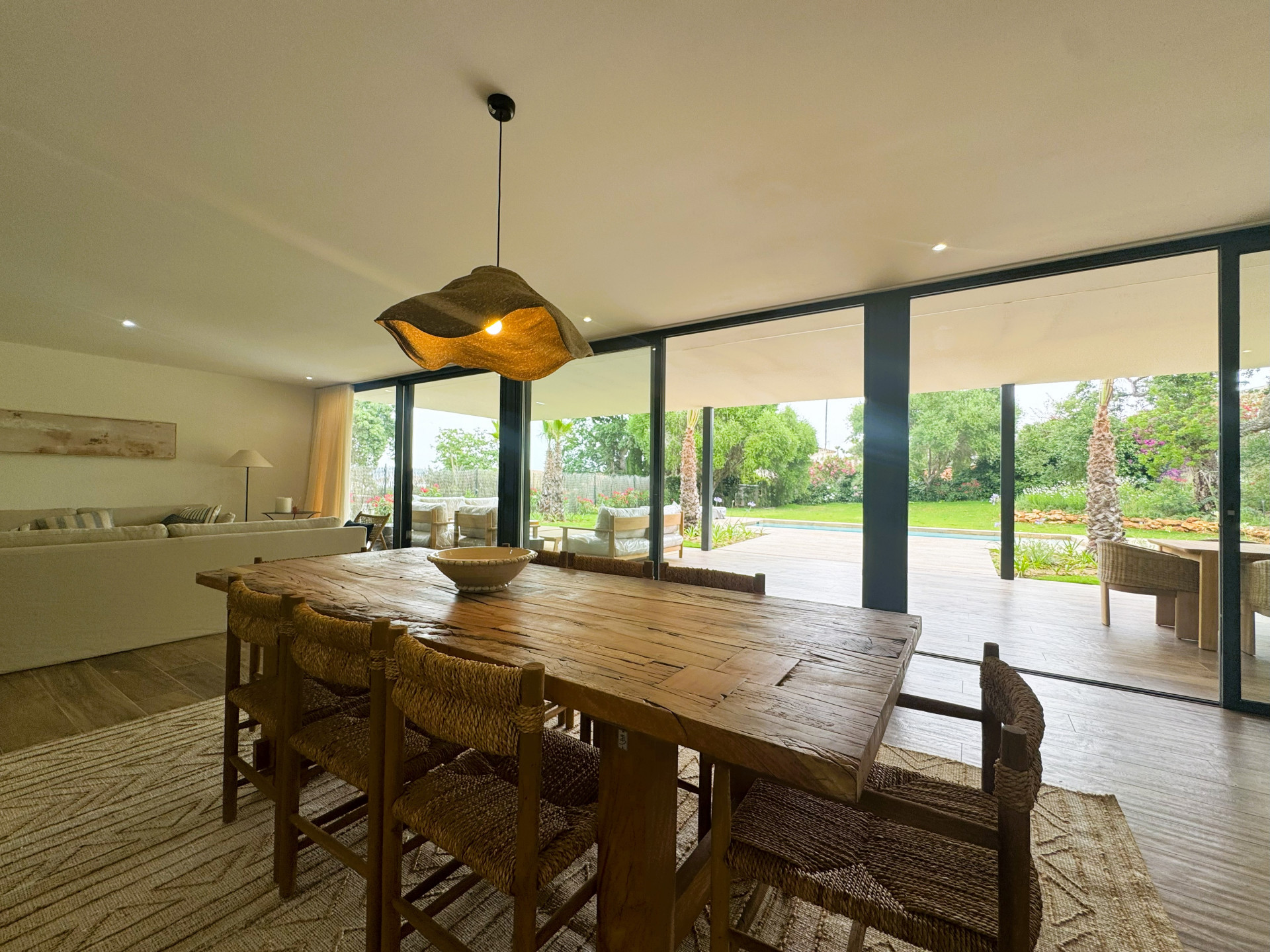 The villa spans an impressive 759m² on a 1,250m² plot, offering ample space for both indoor and outdoor living. It features four spacious ensuite bedrooms, each thoughtfully designed to provide privacy and comfort. The American-style kitchen is a standout feature, blending seamlessly into the open-plan living areas and equipped with state-of-the-art appliances to meet all culinary needs. The property also boasts central heating and air conditioning, ensuring year-round comfort, while solar panels contribute to energy efficiency. With views of the surrounding countryside and the pool, the villa captures the essence of refined living.