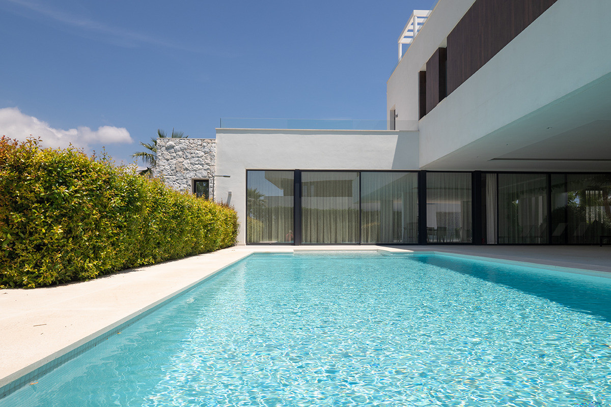 Spanning an impressive 880m², this villa boasts six spacious bedrooms and eight elegantly designed bathrooms, complemented by eight toilets. The open-plan layout is accentuated by large glass doors and windows, seamlessly merging indoor and outdoor living spaces. The fully furnished interior includes a fully fitted kitchen, utility room, and a living room with a fireplace, offering both comfort and style. The villa is equipped with a home automation system, solar panels, and underfloor heating throughout, with additional partial underfloor heating and ceiling cooling systems for optimal climate control.