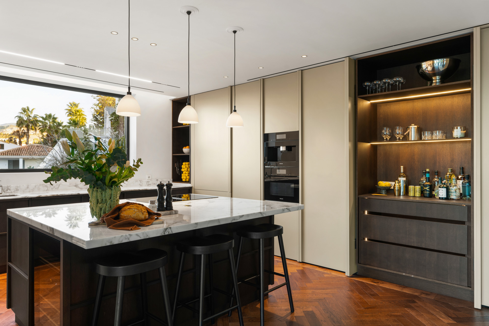 The kitchen is fitted with top of the line Miele appliances and complemented by a stylish dry bar. A separate, concealed chef’s kitchen/scullery provides a highly practical extension, ideal for hosting and preparing meals while maintaining the elegance of the main living space.